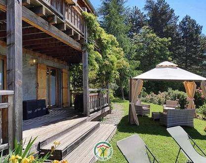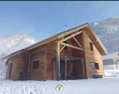 Beautiful contemporary wood-frame chalet on a medium-altitude hill, south facing. On first floor : some room of living over the wooden terrace, fireplace.