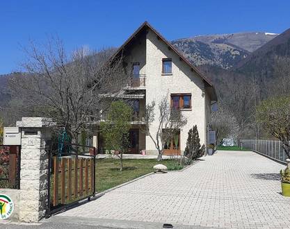 Former 19th-century stable entirely renovated in the mid-altitude mountains, in the heart of nature with panoramic views over peaks of up to 2,500 metres. This large gîte, refurbished over two levels for 12 people, includes 4 bdrs., of which 2 bdrs. are doubles (ground floor and 1st floor), and 2 are family rooms. 1st floor: 1 double, 2 singles. Washroom and WC on each floor. Fitted kitchen. Large, very well-lit dining room opening onto a south-facing terrace, lounge area. Garden furniture, barbecue, parking. Garden and orchard below. Nearby are Lac du Sautet water sports centre, marked routes, the Natural Park of Ecrins and Trièves, Notre Dame de la Salette, Himalayan bridges