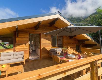 Een Chalet met een oppervalkte van 20m2 met een mezzanine ( een groot en drie eenpersoonsbedden, amerikaanse keuken en badkamer. Terras met zicht op de obiou en Farraud.
